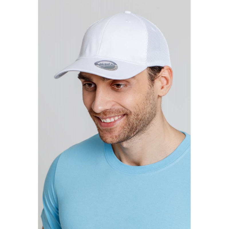 - Однотонная бейсболка из двух видов ткани: козырек и лобовые клинья из гладкого полотна, клинья на боках и на тыльной стороне из спортивной сетки