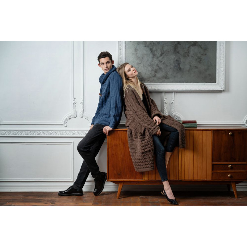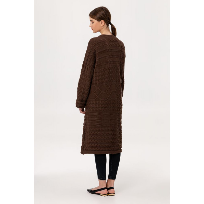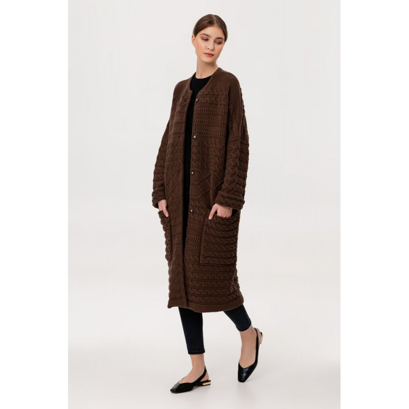 Длинный кардиган-пальто фактурной вязки с косами из дополнительно смягченной пряжи.
