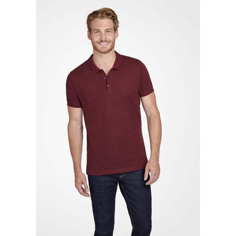 Кроеная (с боковыми швами) рубашка поло с печатным рисунком. Воротник с укрепляющей тесьмой и манжеты в рубчик, планка с 3 пуговицами тон в тон, боковые разрезы снизу.